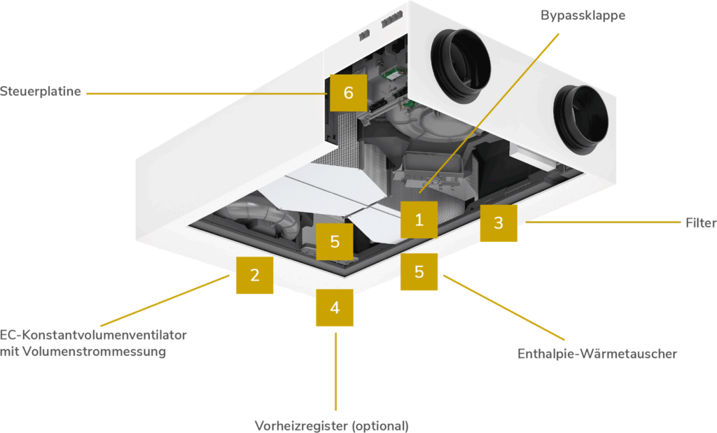 Enthalpie-Wärmetauscher sorgt für optimale Luftfeuchtigkeit und angenehmes Wohnklima.
